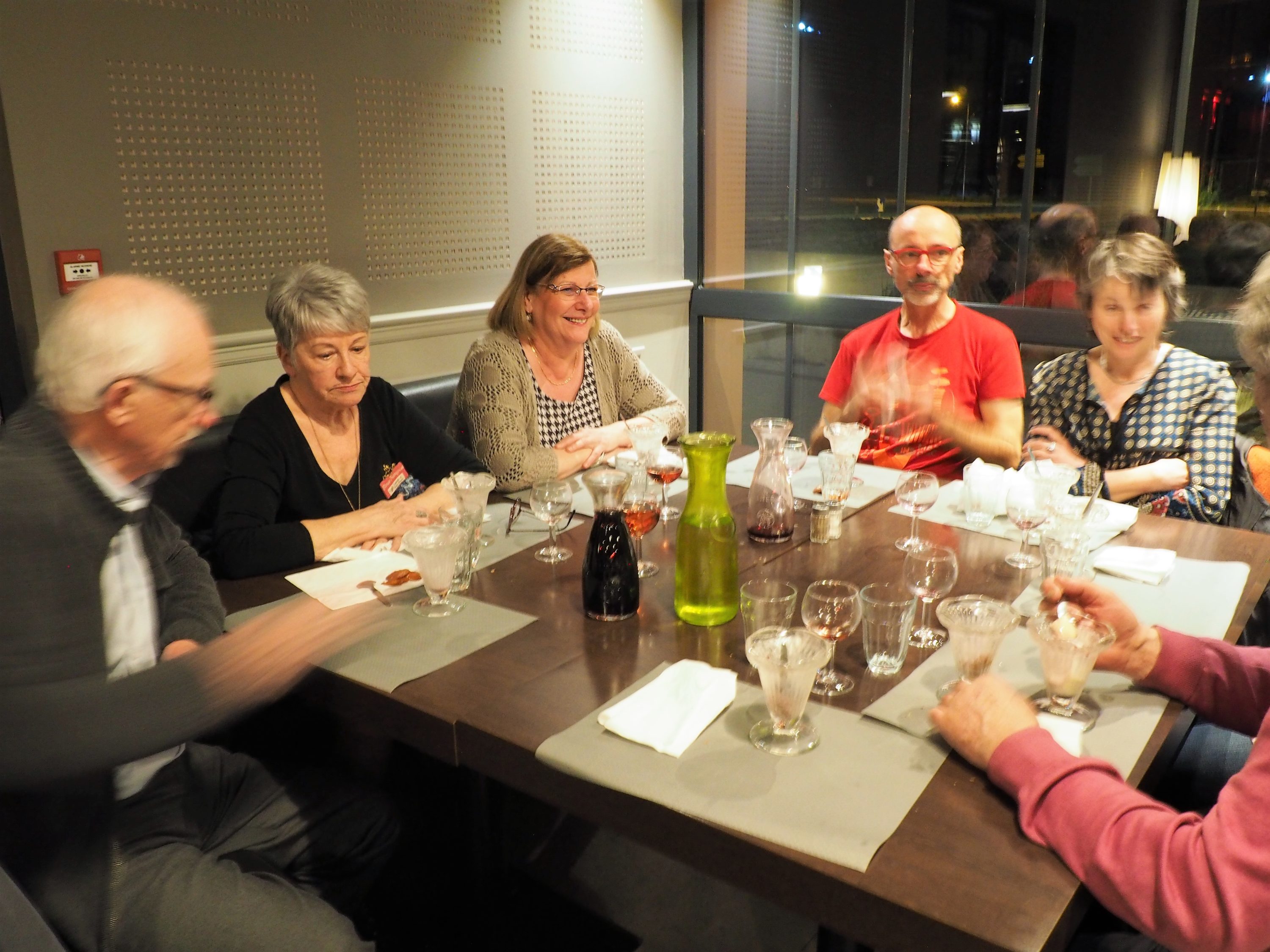 Depuis l’an passé, nous nous rendons au restaurant, faute de temps suffisant pour préparer la salle “at home” comme nous le faisions au début. Et puis mettre les pieds sous la table après une bonne journée de labeur, c’est aussi bien agréable pour nous organisateurs, crois moi lecteur !