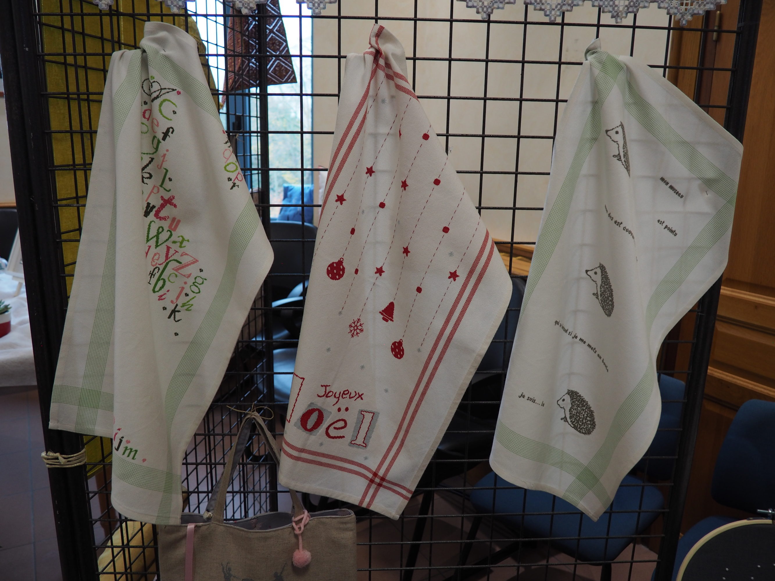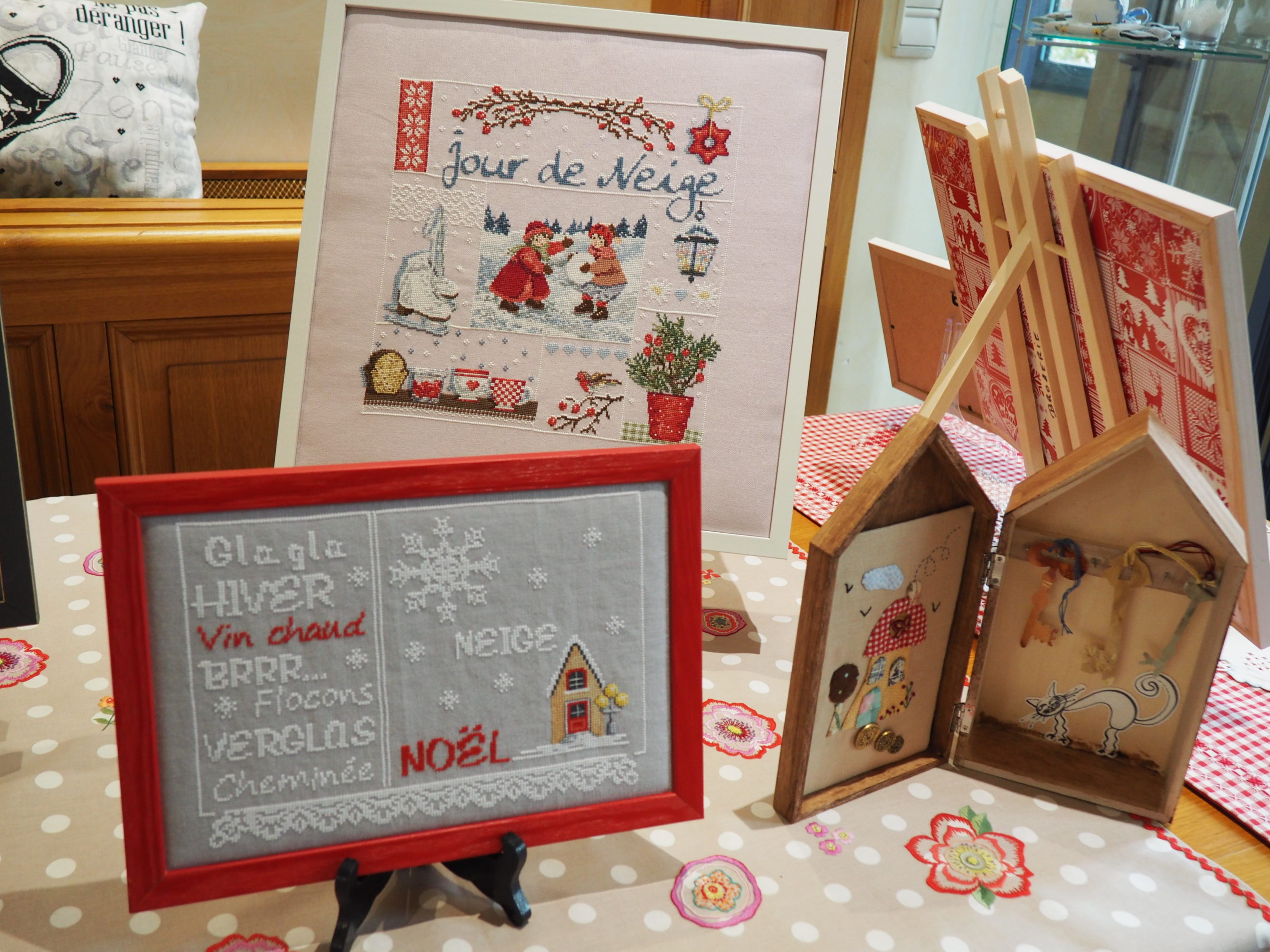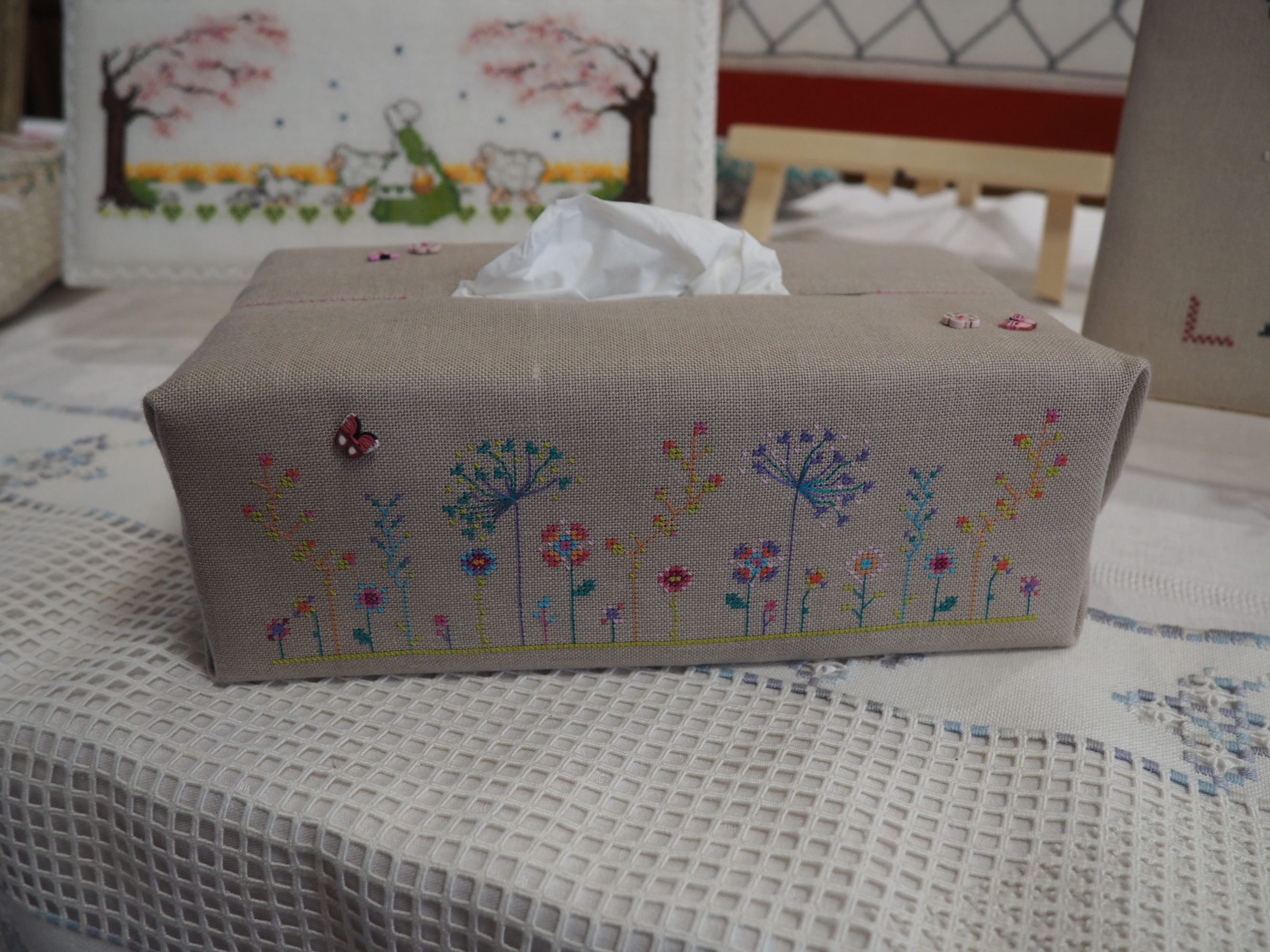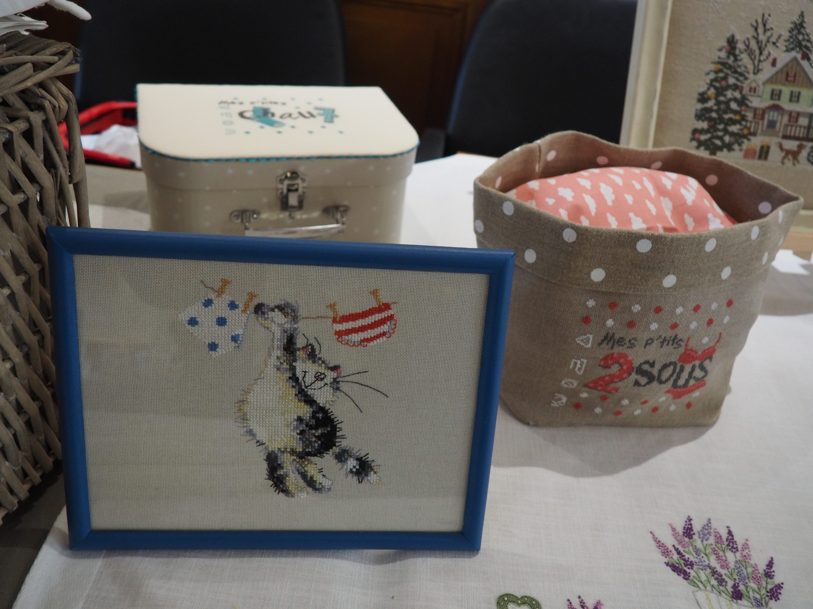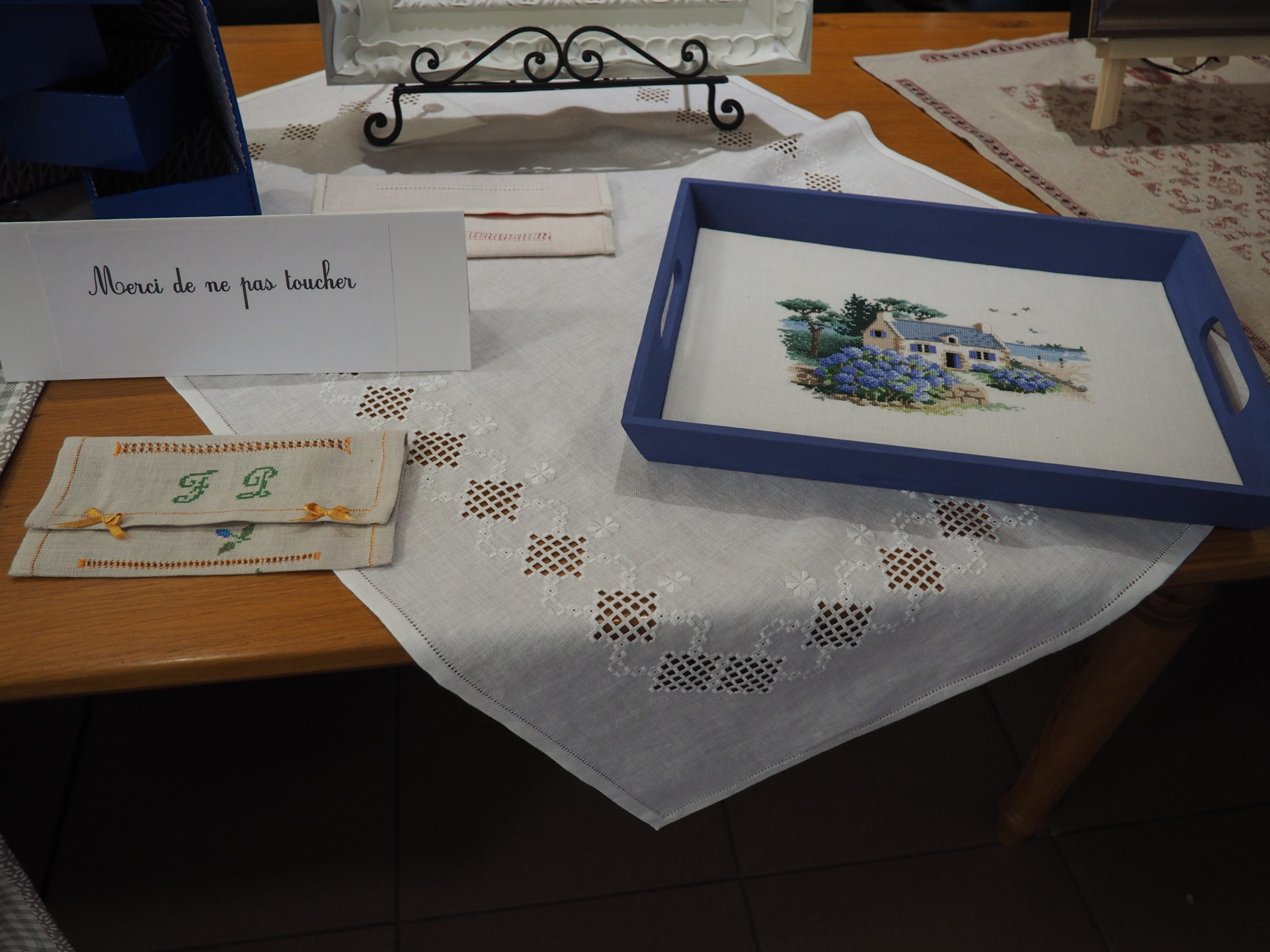 Que nous reste-t-il ? Et bien les beaux torchons, les nappes magnifiques sur lesquelles les ouvrages étaient posés et mis en valeur, quelques coussins et ouvrages plus spéciaux.