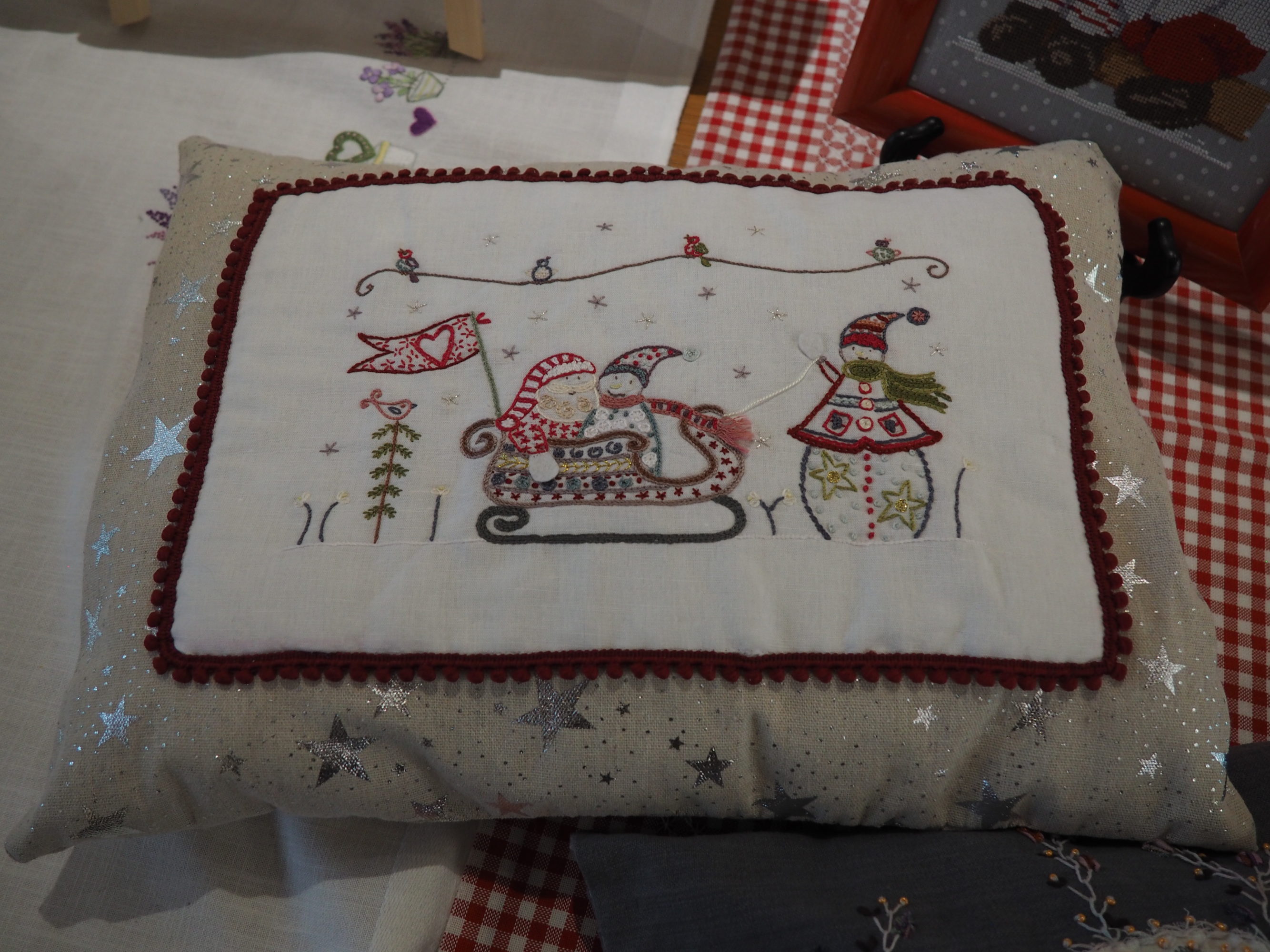 Un coussin qui va faire l’objet d’un futur atelier au sein du club de Castanet pour étudier la technique de broderie italienne utilisée qui s’appelle si je me souviens bien le Reticcello. C’est sous la houlette de l’adhérente qui en maîtrise parfaitement la technique maintenant comme tu peux le voir lecteur, que les membres du club vont progresser petit à petit.