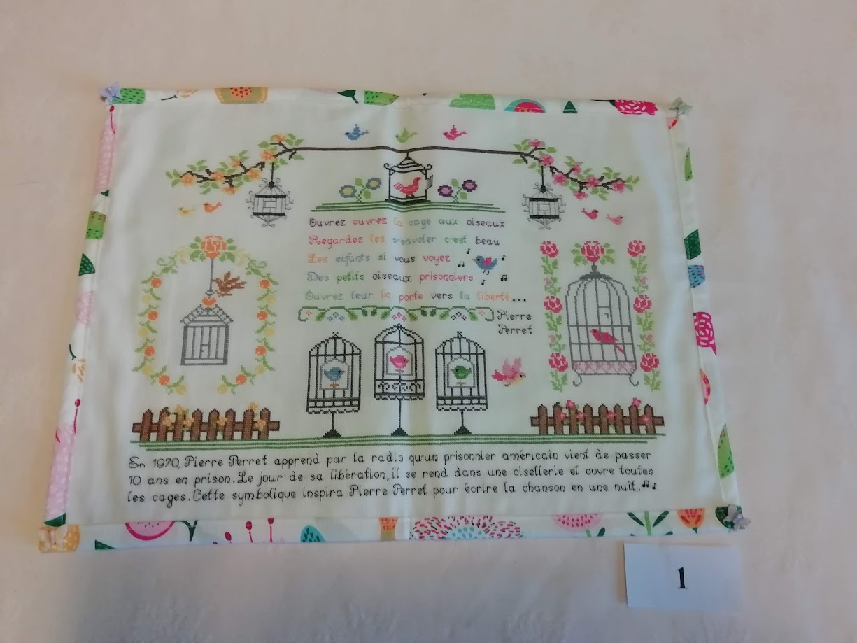 N° 1 – Brigitte Labadie – “Ouvrez la cage aux oiseaux” Création à partir de divers modèles sur Pinterest – Point de croix
