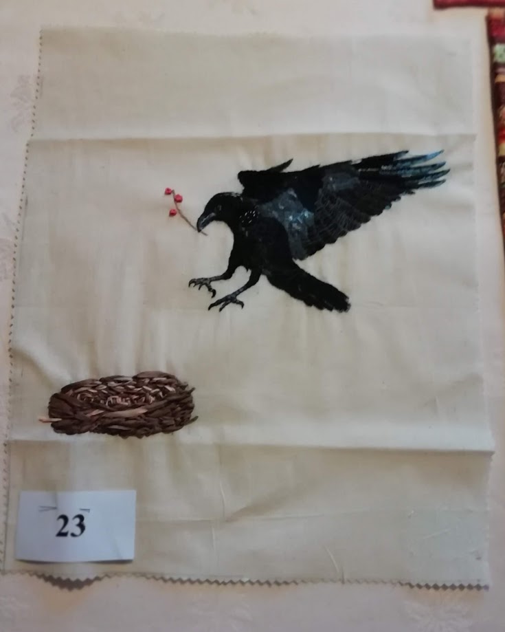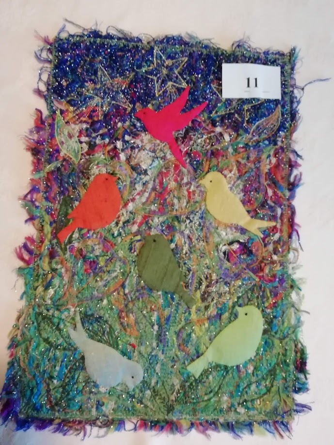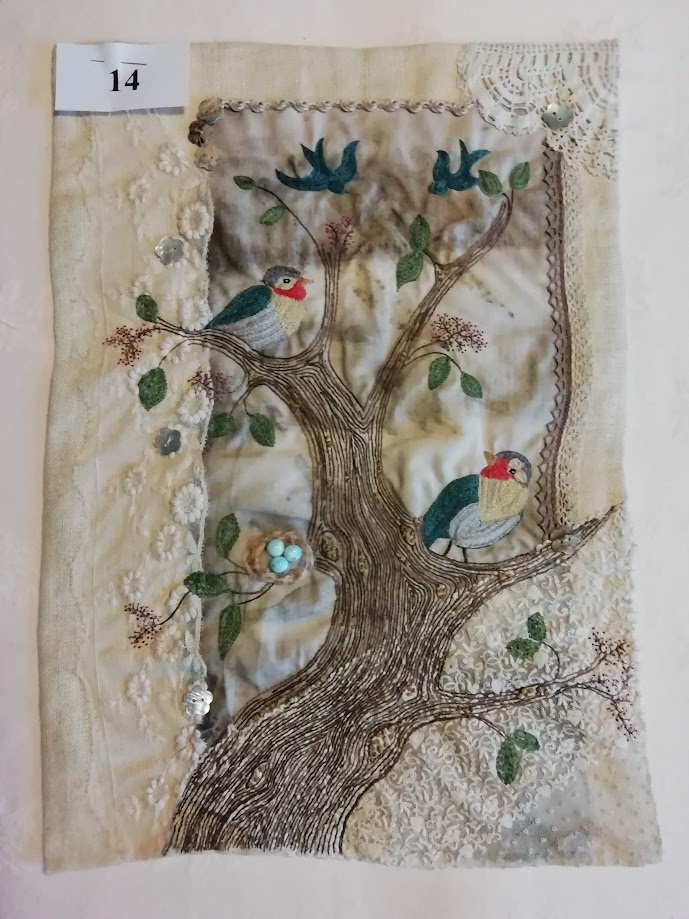 N°11 Marie-Hélène Malgouyres -Création, support fibres collées sur Tarlatane, oiseaux en shantoung appliqués.