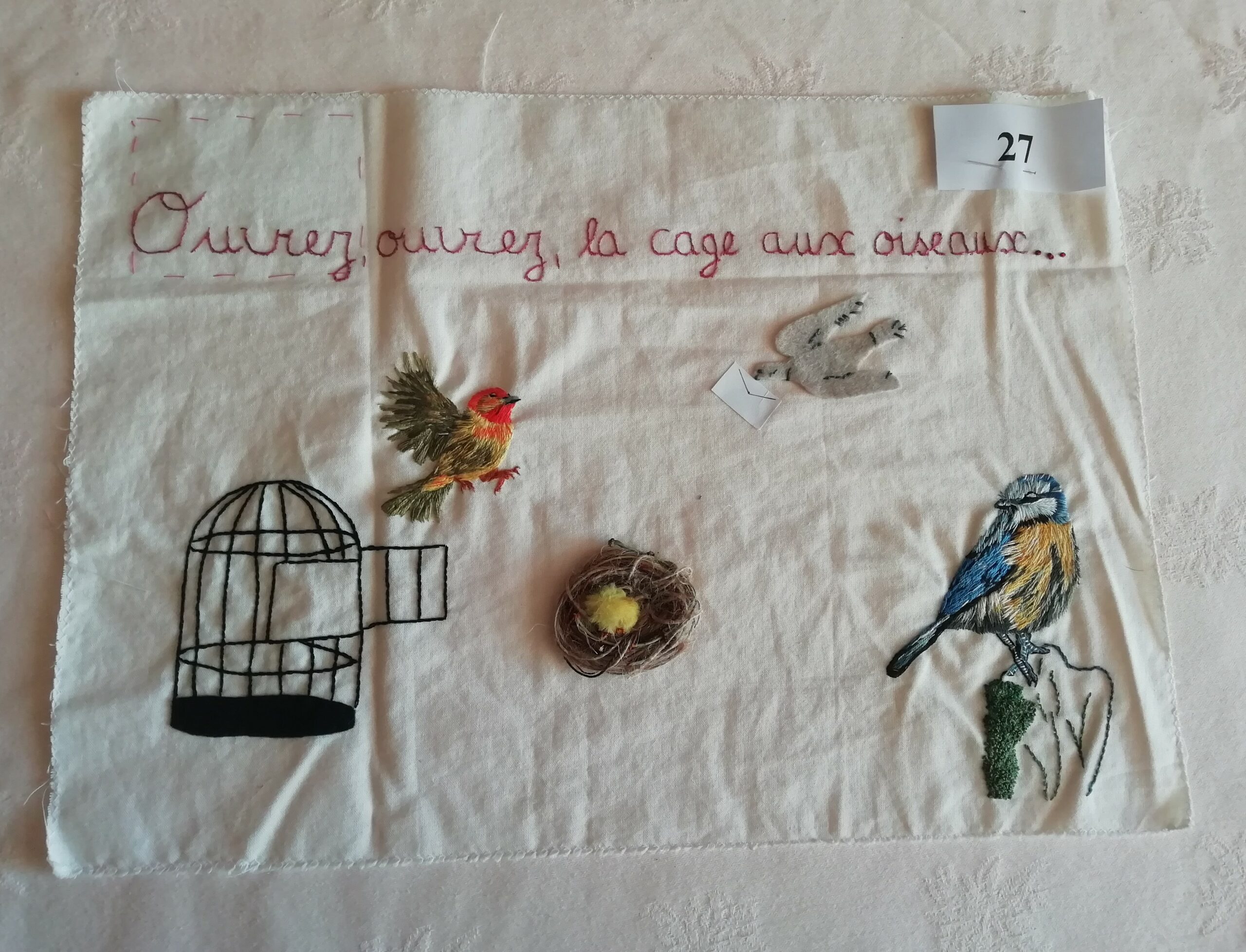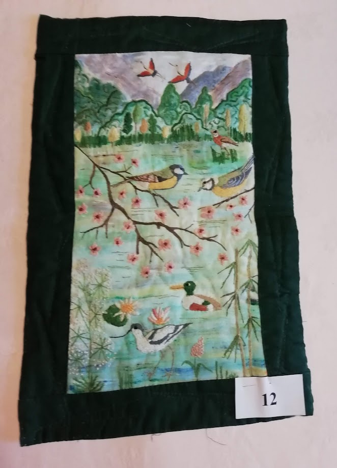 N° 12 Danièle Cerabtolla – Création. Fond peinture textile, décors et oiseaux brodés fils DMC.
