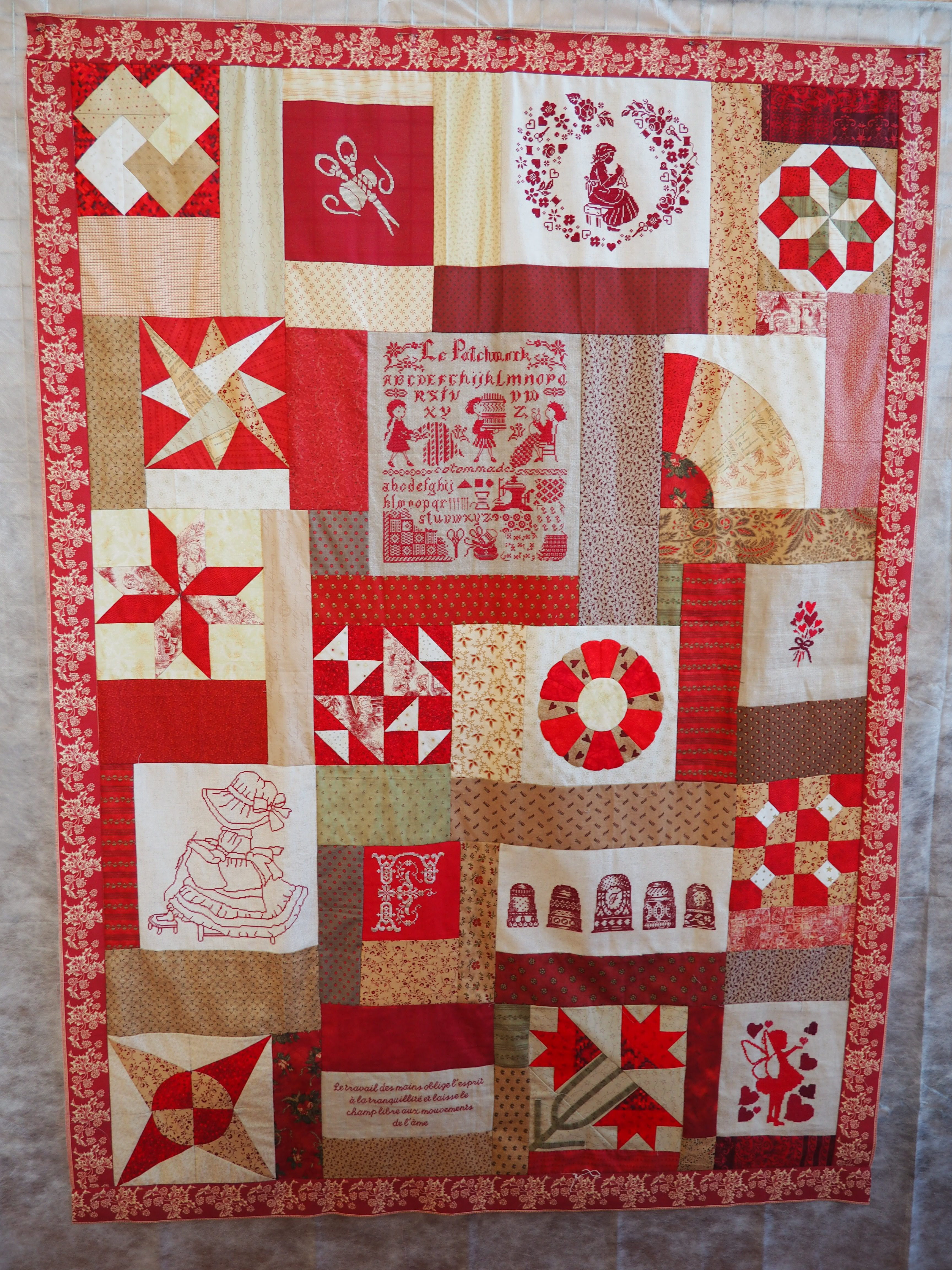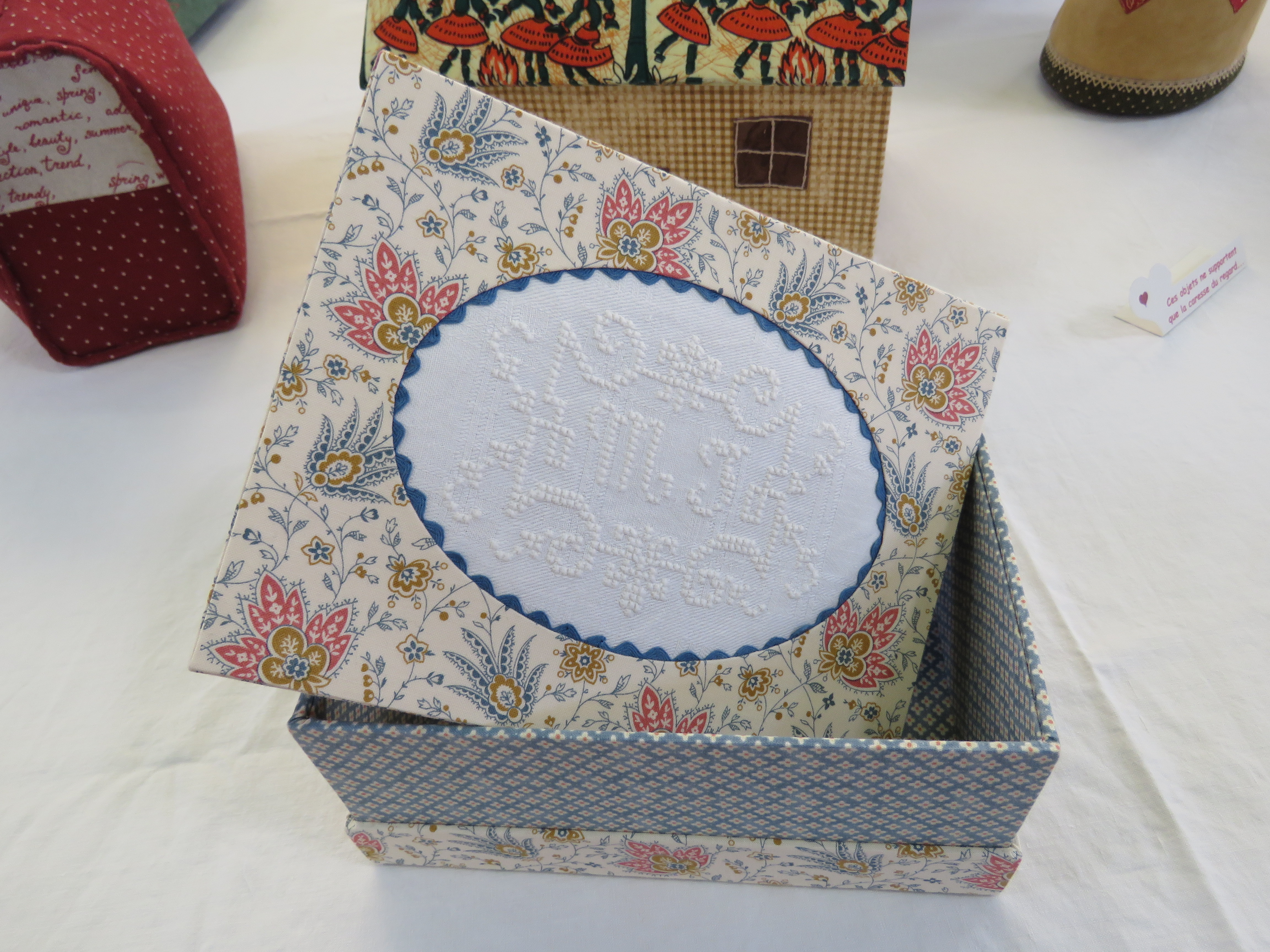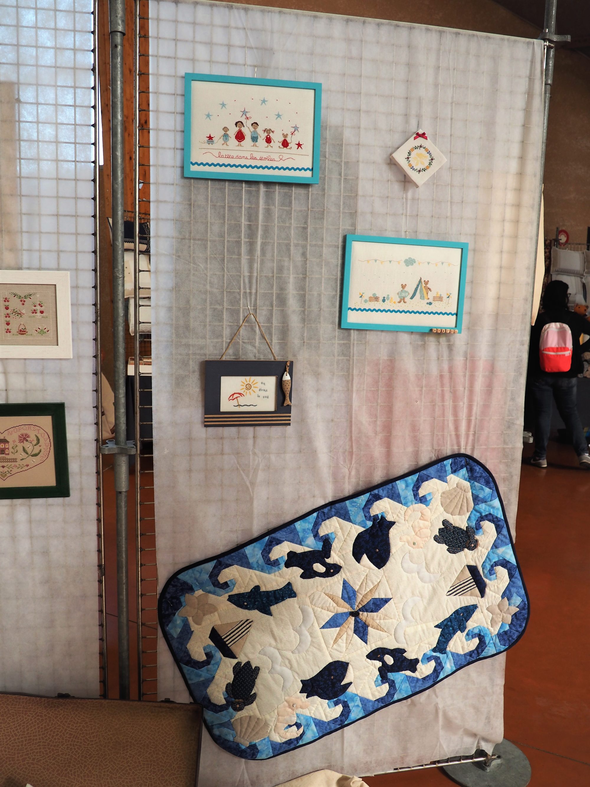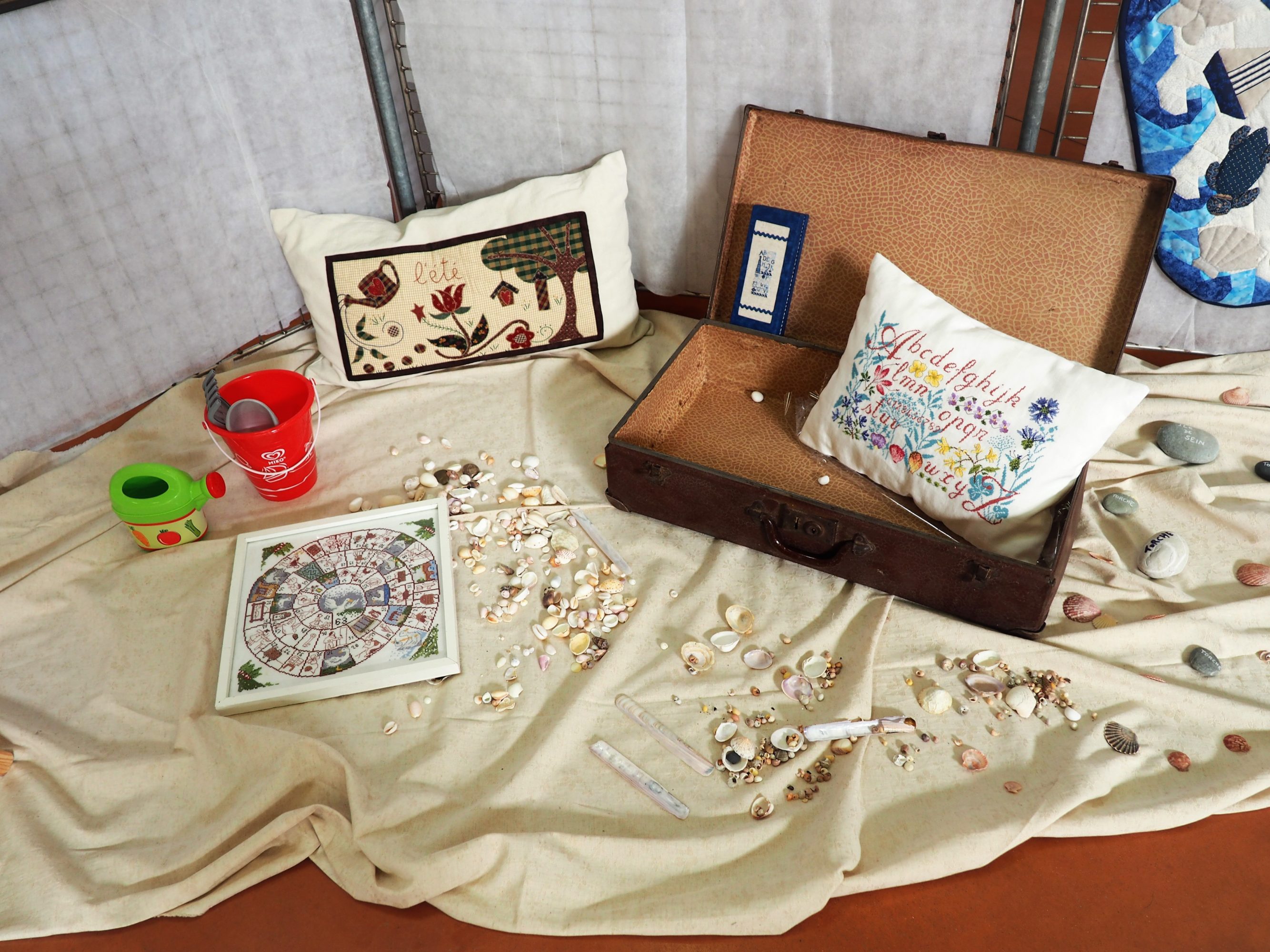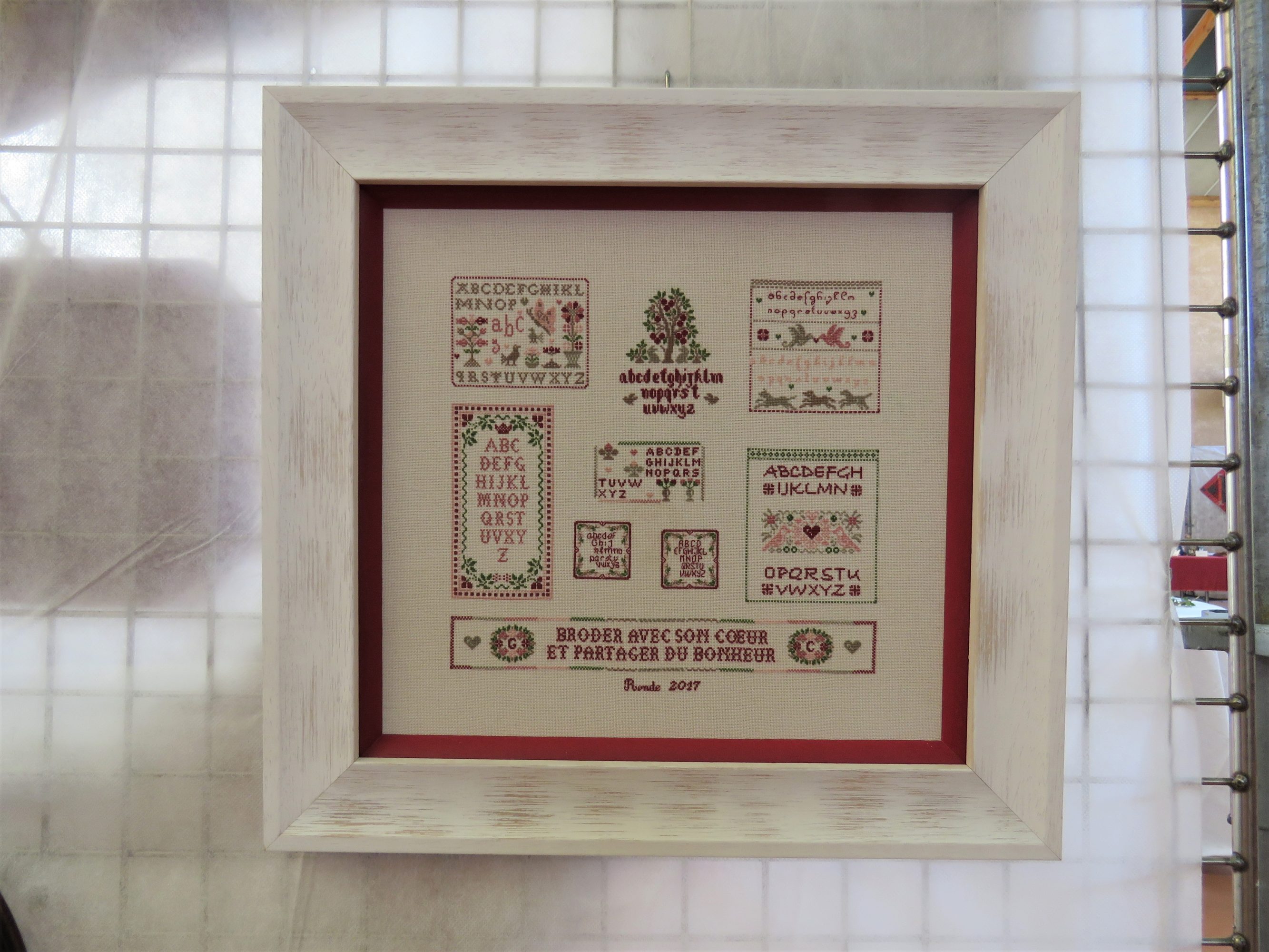Nous finirons aujourd’hui avec ce qui a été l’ouvrage en commun du club. Chacune a brodé son prénom dans un cercle à broder et l’a illustré (ou pas) de ce qu’elle souhaitait. Taille du cercle, toile choisie, technique utilisée, tout était libre, l’imagination était reine.