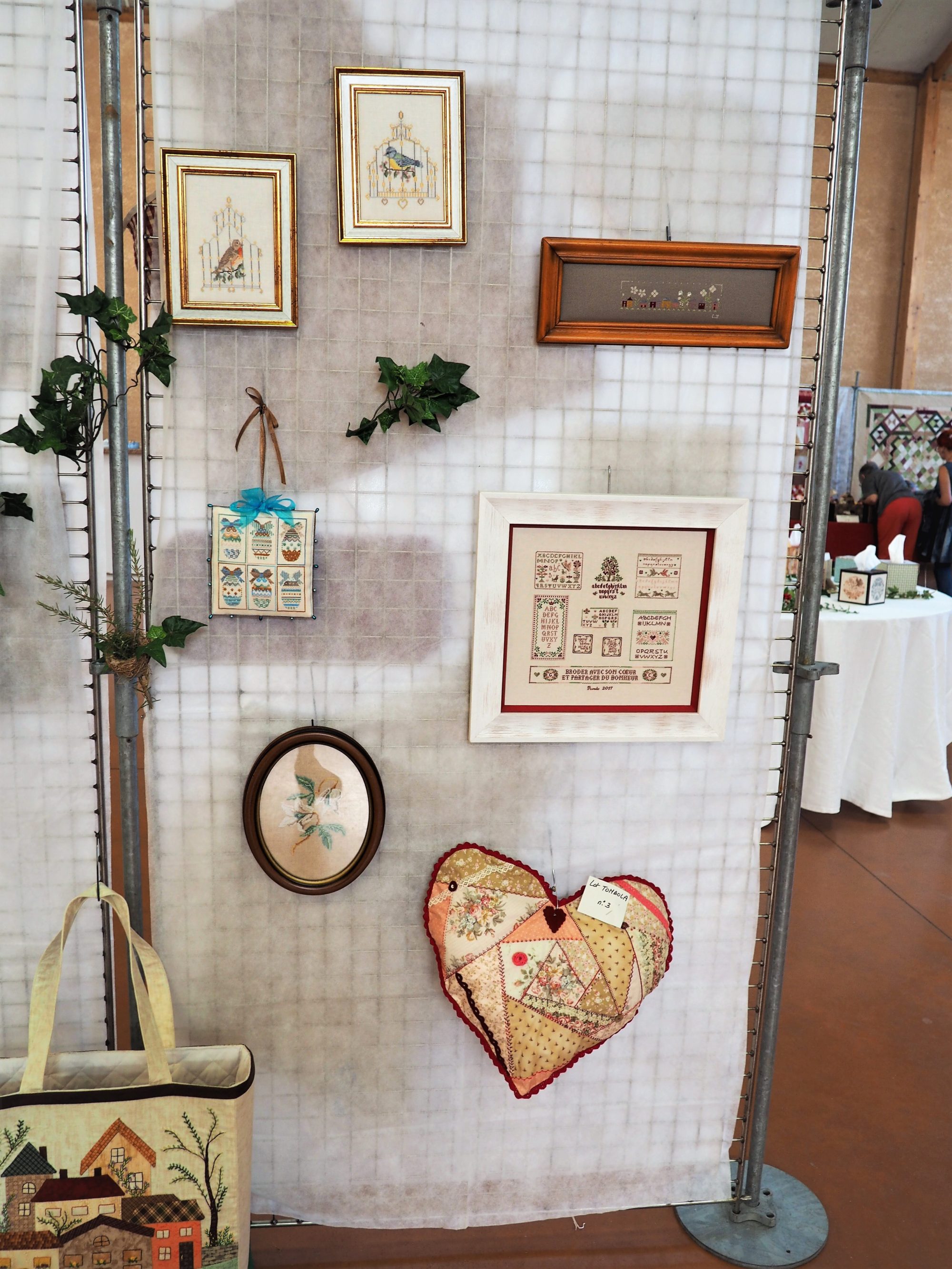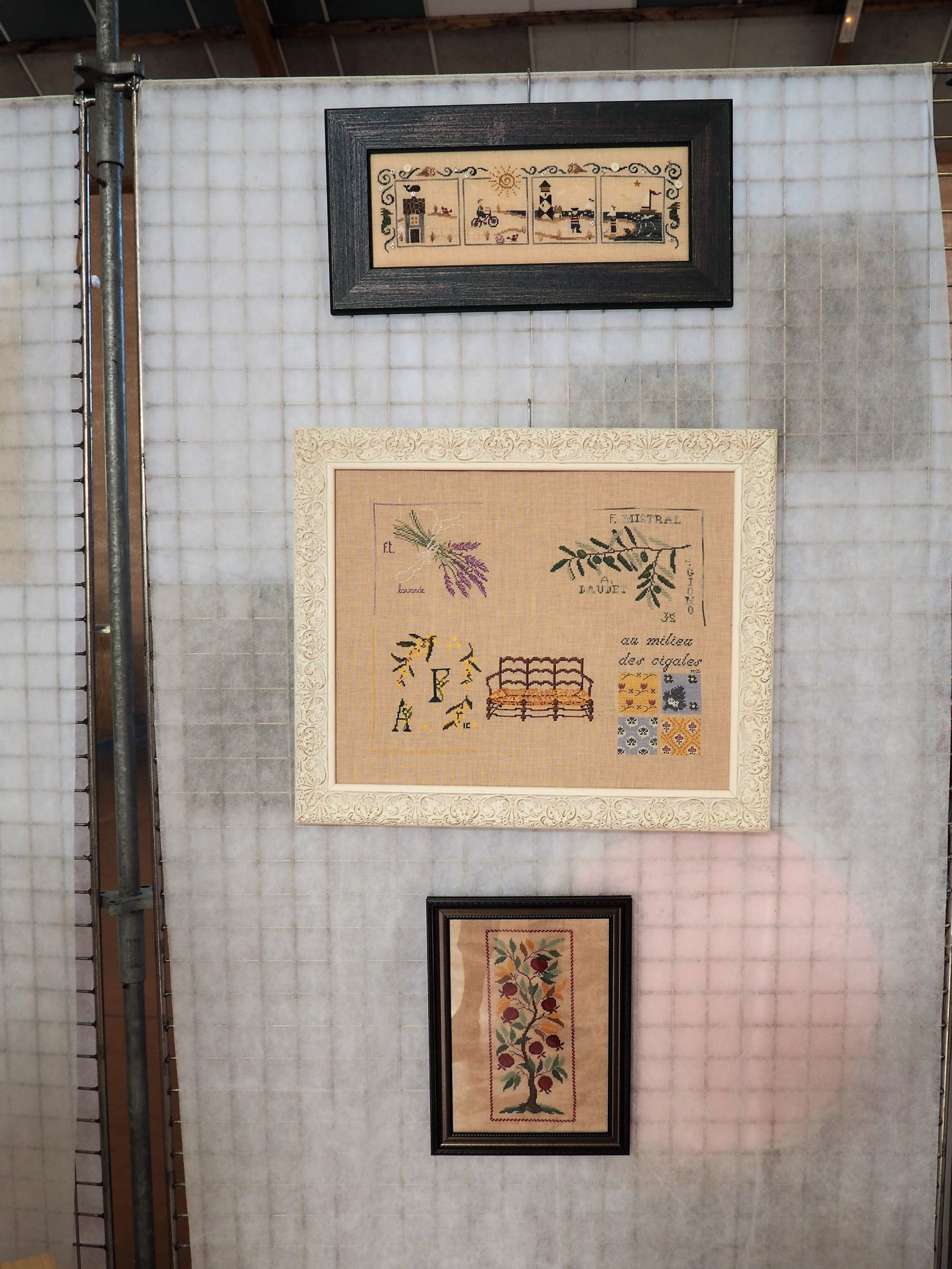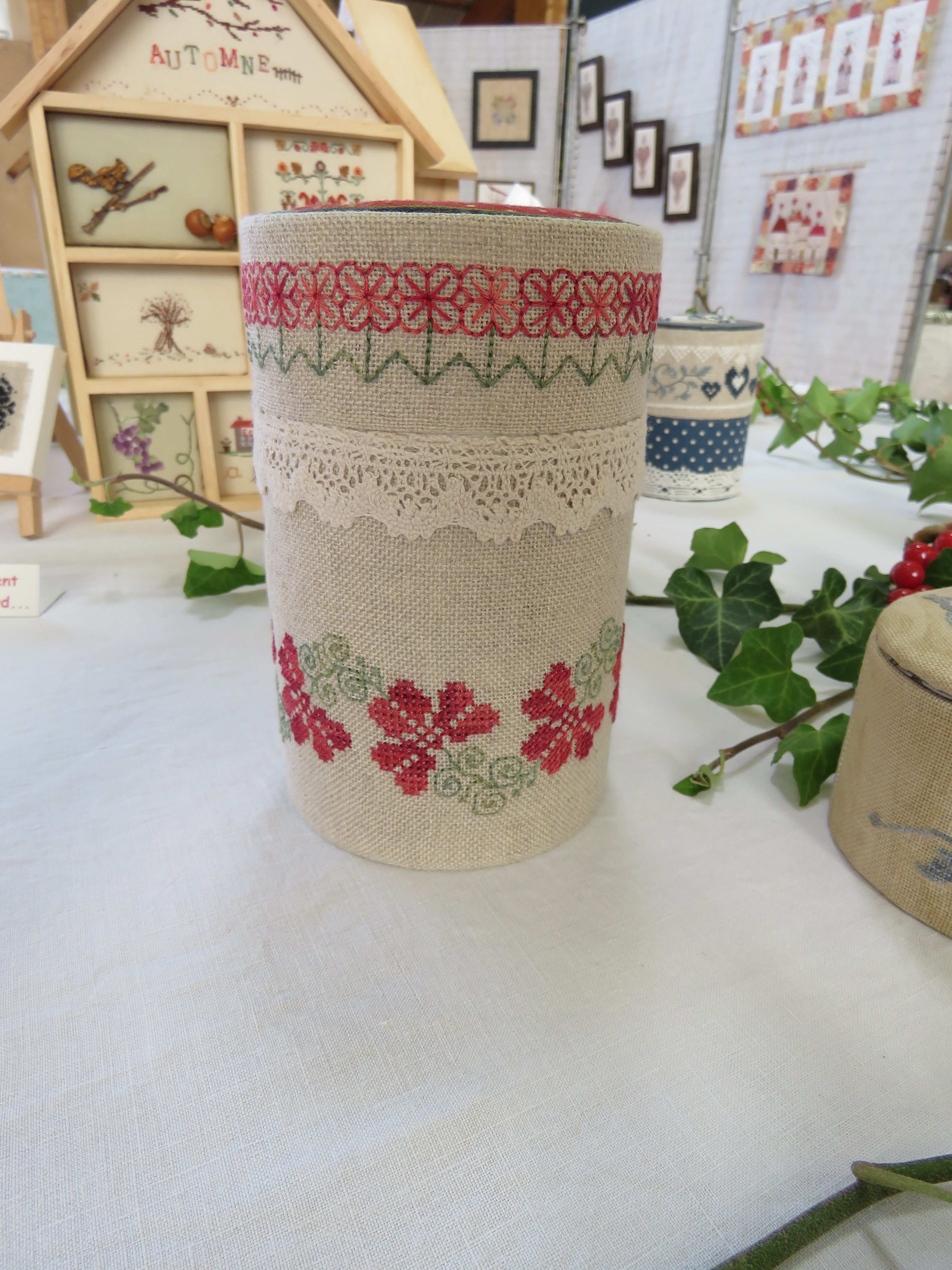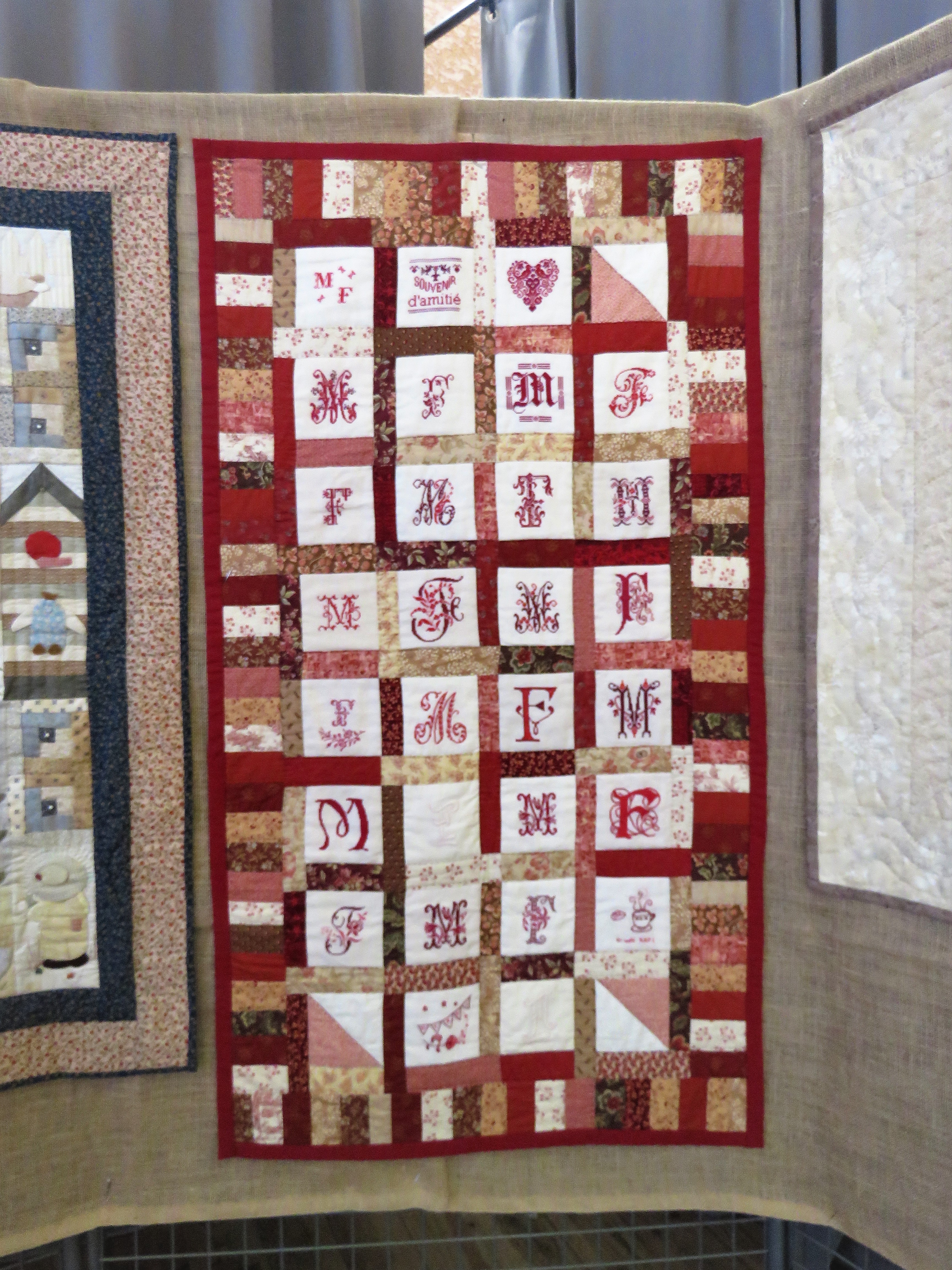 Nous finirons aujourd’hui avec ce qui a été l’ouvrage en commun du club. Chacune a brodé son prénom dans un cercle à broder et l’a illustré (ou pas) de ce qu’elle souhaitait. Taille du cercle, toile choisie, technique utilisée, tout était libre, l’imagination était reine.