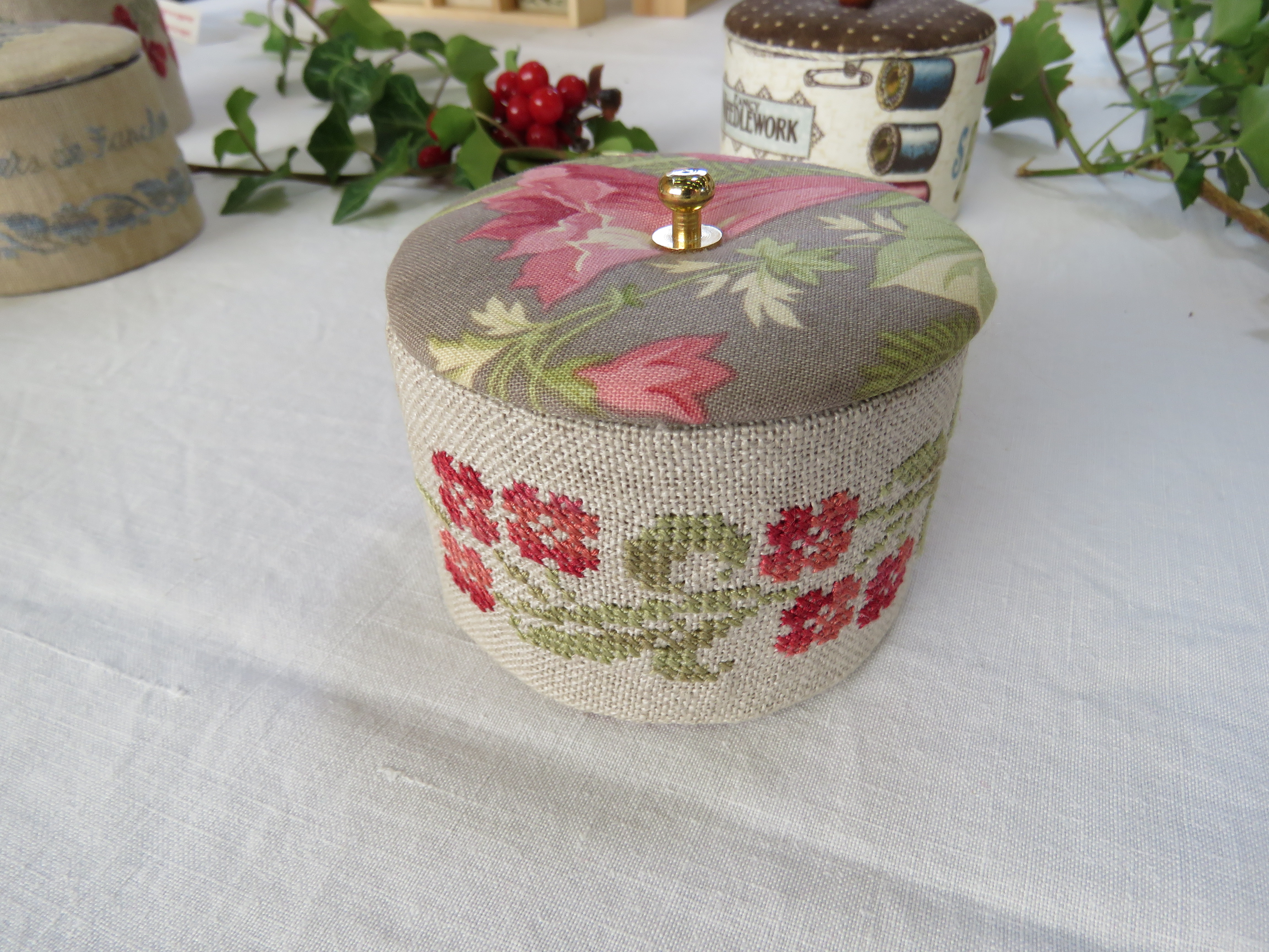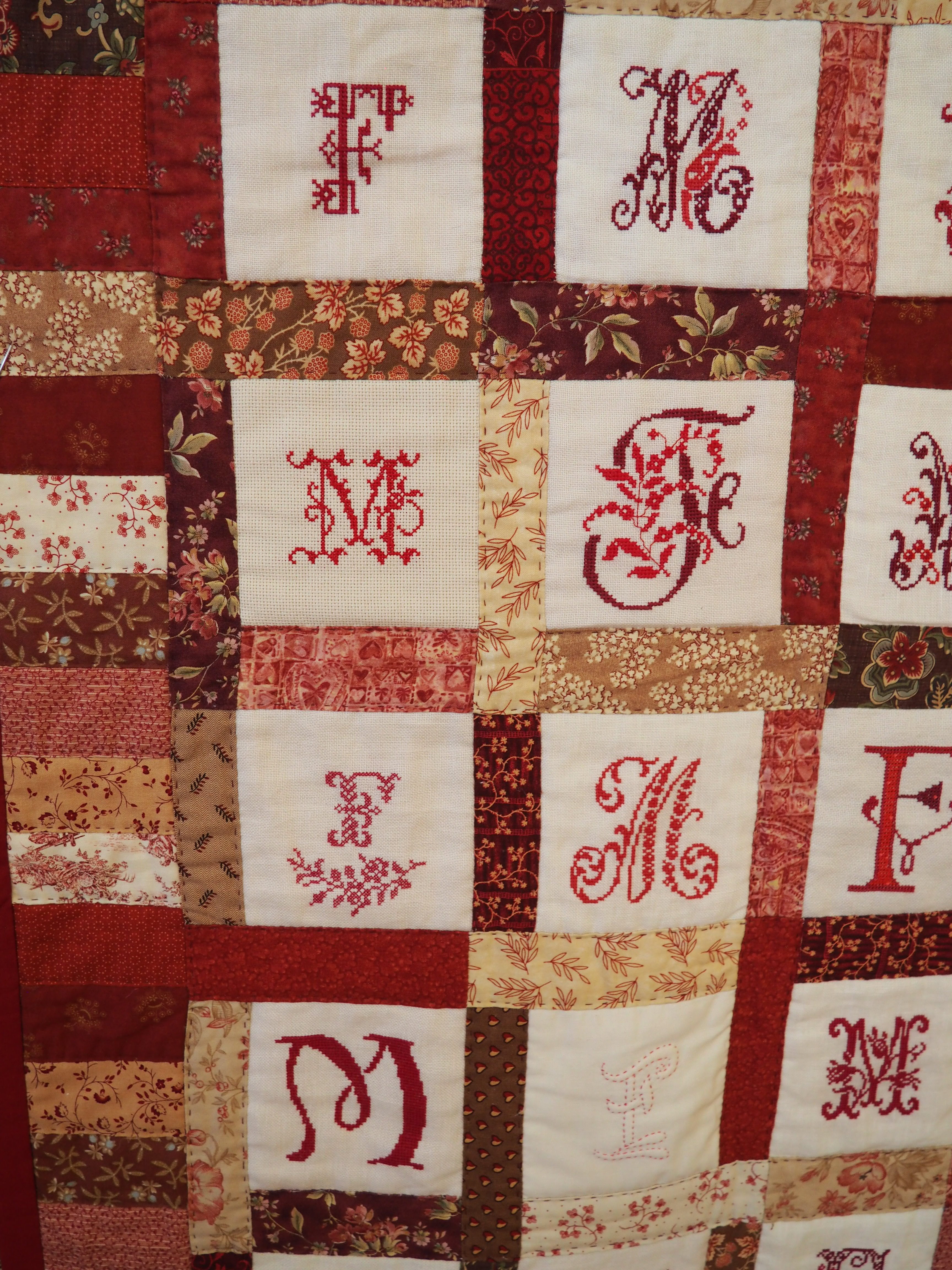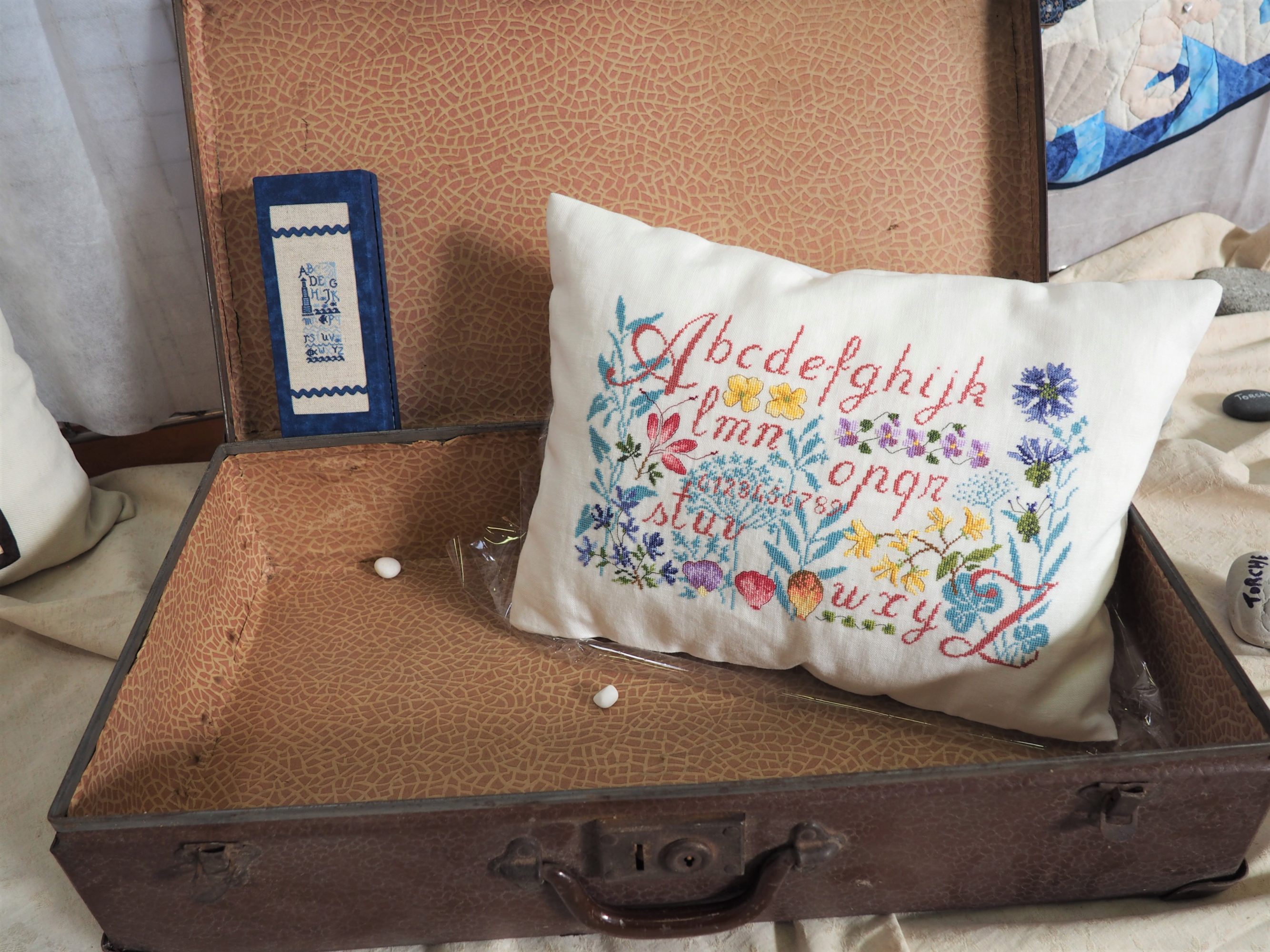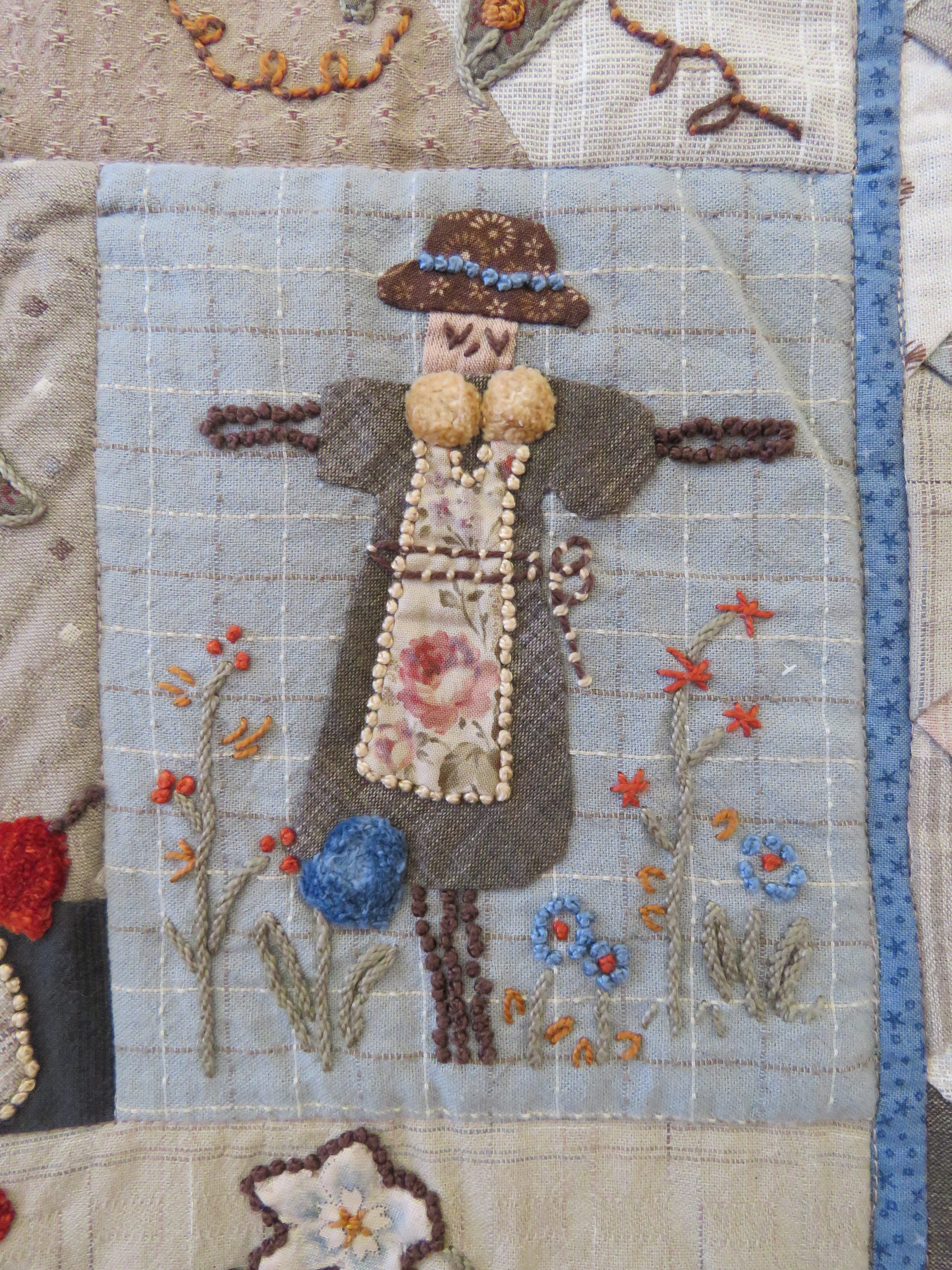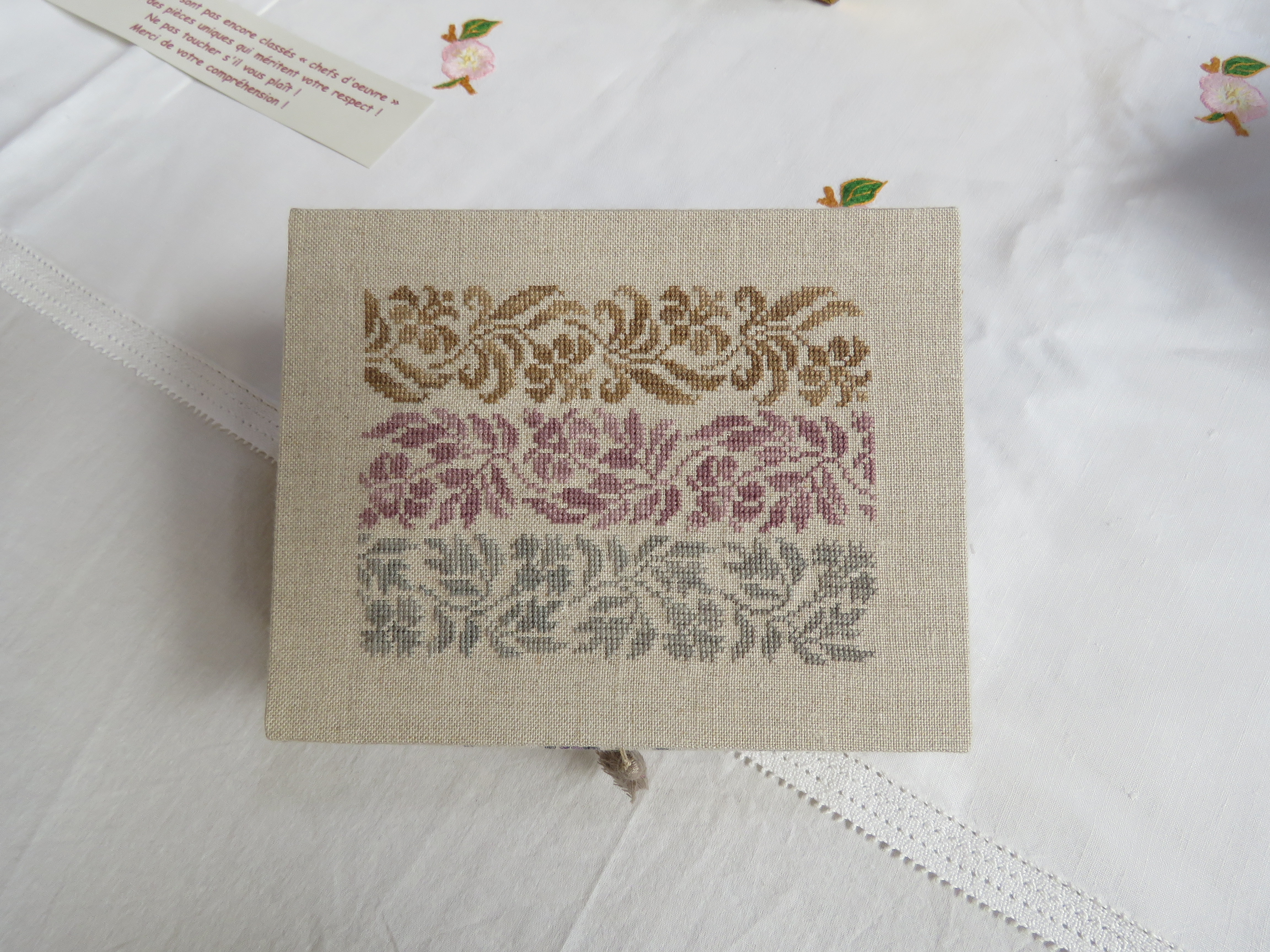 Nous finirons aujourd’hui avec ce qui a été l’ouvrage en commun du club. Chacune a brodé son prénom dans un cercle à broder et l’a illustré (ou pas) de ce qu’elle souhaitait. Taille du cercle, toile choisie, technique utilisée, tout était libre, l’imagination était reine.